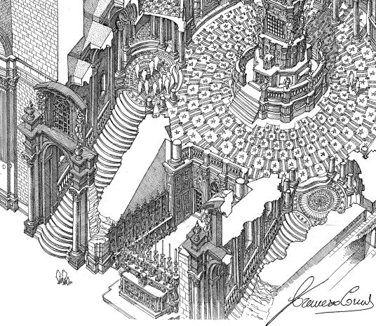 Ma ciò che rende unico questo sistema di scale è il fatto che i gradini oltre ad esibire una linea curva che non è la sezione di un cerchio, bensì di unellissi (le concezioni astronomiche di Guarini allineate con il sapere astronomico del suo tempo inaugurano questa nuova figura geometrica legata allorbita della terra), sono realizzati con una pendenza invertita, che anziché facilitare il movimento in salita, lo rendono più irto e difficoltoso, mentre osservate dallalto, o percorse verso il basso comunicano quasi lidea di un dirupo lungo il quale è facile scivolare.