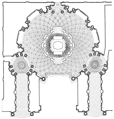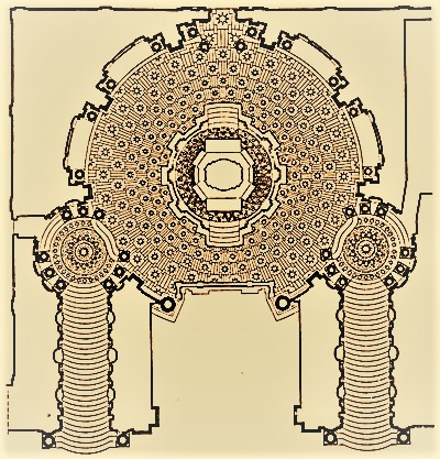 Un percorso lungo 30 gradini, che giunge al pianerottolo anchesso circolare oltre il quale gli ultimi 3 gradini (gli anni della predicazione di Cristo) immettono nellaula della cappella vera e propria. Qui la geometria e il numero sono simboli sacri e non sfugge che la gradinata nel suo complesso rappresenti gli anni della vita terrena di Gesù. Del resto, tutte le proporzioni interne alla cappella celebreranno i multipli del 3.